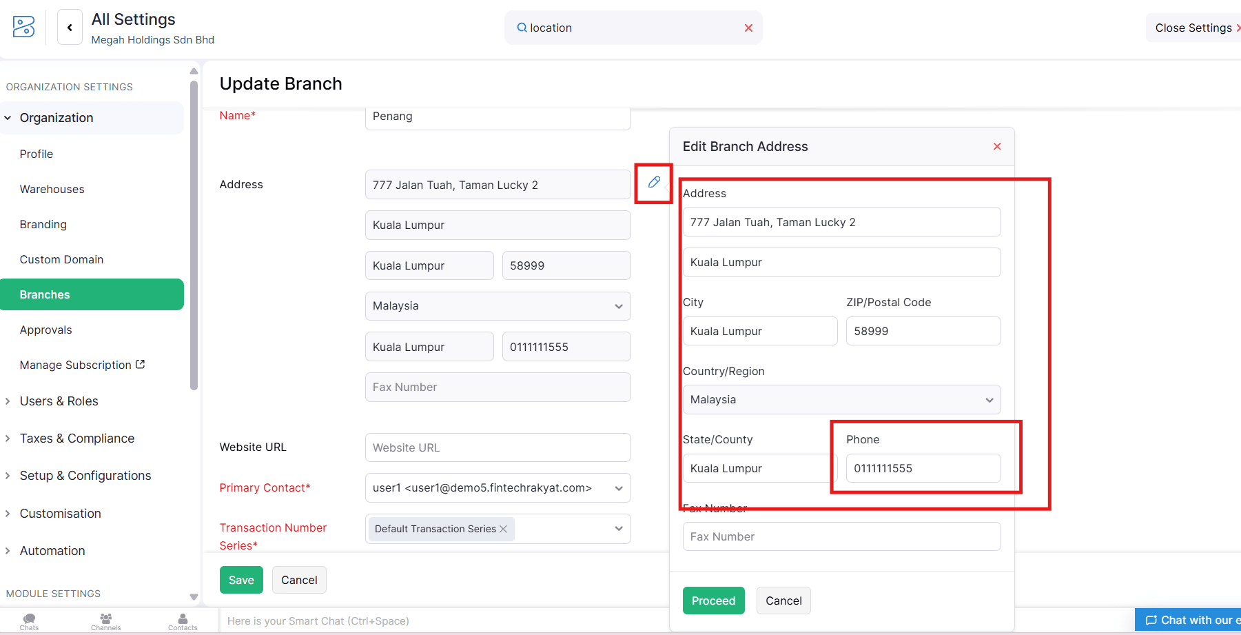 Depending on your Zoho Books environment, your organization address and phone number may be stored in different places.