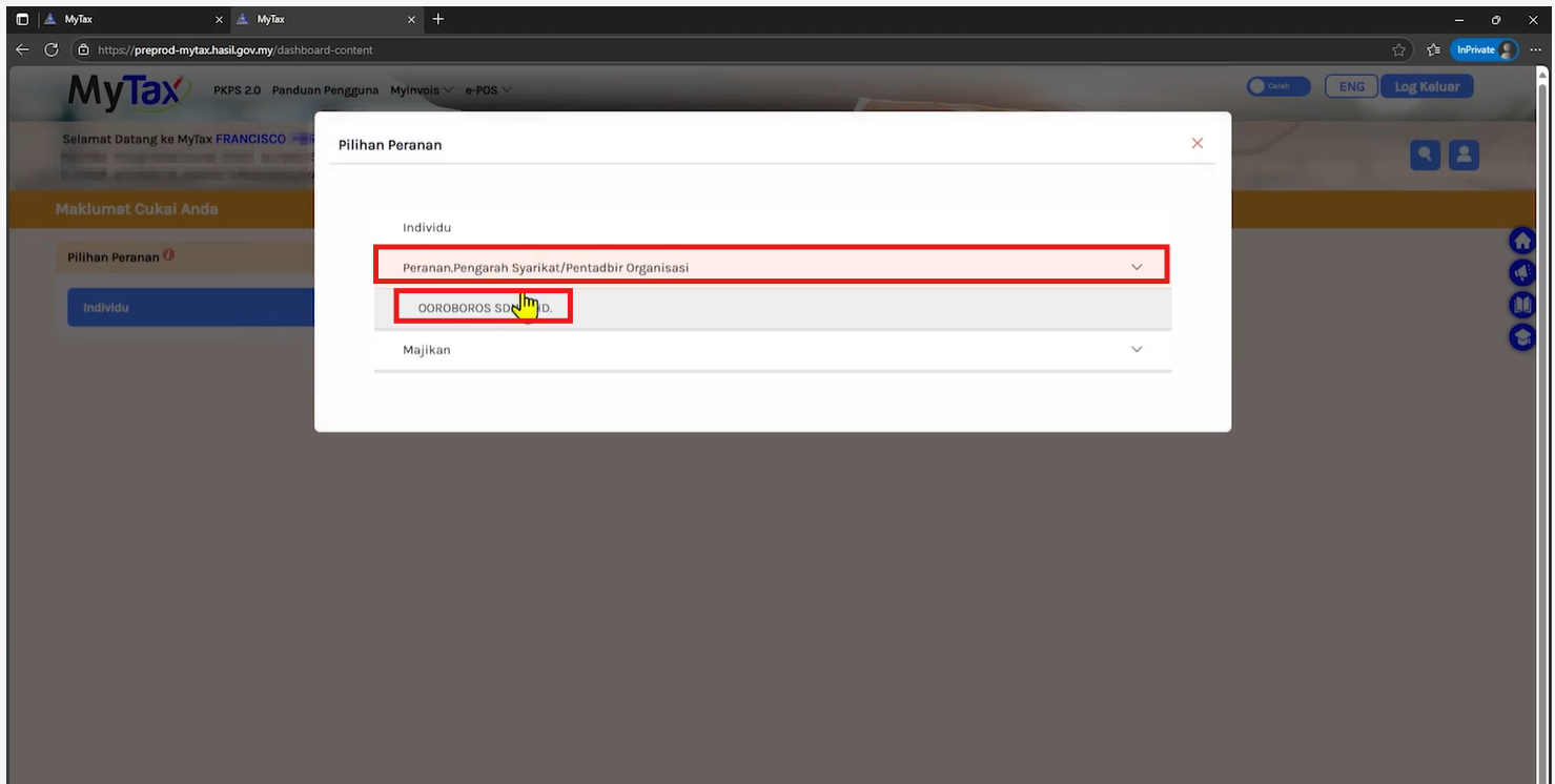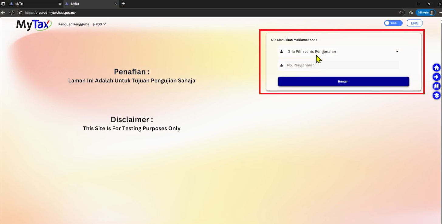 Once registered, you can access the portal (https://preprod-mytax.hasil.gov.my/) using the following steps: